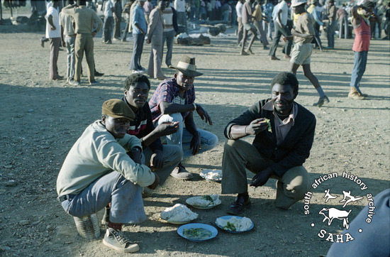 ► 4A_80_04 :: A group of refugees eating in the Francistown transit camp