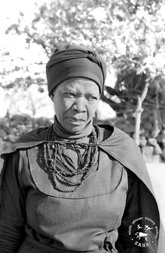 This black and white photograph of Driefontein resident Nomhlangano Beauty Mkhize, Saul Mkhize's widow, was taken by Gille de Vlieg in June 1983. Included in SAHA Land Act Project report, 2014. |