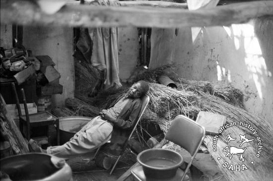This black and white photograph of a man sleeping after too much night vigil (death of Saul Mkhize), was taken by Gille de Vlieg in Driefontein, Mpumalanga, on 16 April 1983. This photograph was digitised by Africa Media Online in 2009. |
