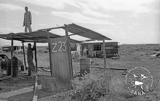 This black and white photograph of men building a new home structure in Barseba was taken by Gille de Vlieg in March 1984. Included in SAHA Land Act Project report, 2014. |