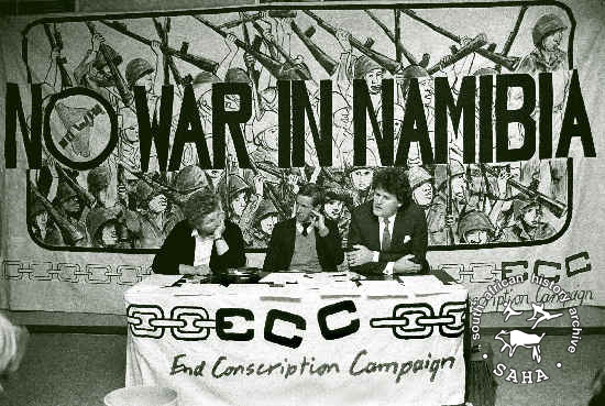 Sheena Duncan (Black Sash), Peter Harris (SA lawyer), Anton Lubowski (Namibian lawyer, later assassinated), ECC & Namibia, July 1984. |