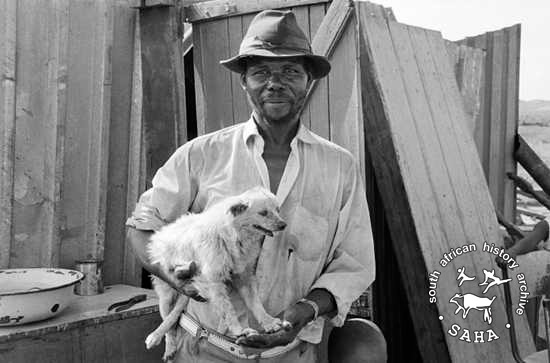 This black and white photograph of a man with his dog, standing outside his newly built home in Barseba was taken by Gille de Vlieg in March 1984. This photograph was digitised by Africa Media Online (AMO) in 2009. Included in SAHA Land Act Project report, 2014. |