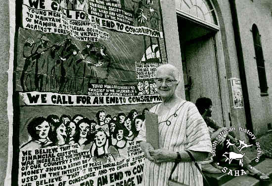 This black and white photograph of Helen Joseph standing in front of an End Conscription Campaign (ECC) banner was taken by Gille de Vlieg in September 1984, in Pageview. This photograph was digitised by Africa Media Online (AMO) in 2009. |