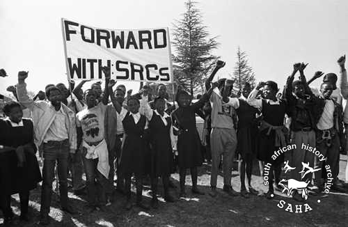 This black and white photograph of students holding a banner 'Forward with SRCs' at the funeral of Hendrik Nkuna in Tembisa was taken by Gille de Vlieg on 25 August 1984, and digitised by her in 2009.