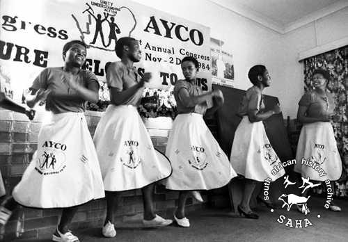 This is an image of a group of girl wearing what seems to be the AYCO uniform performing during a conference in Wilgespruit, taken by Gille de Vlieg, in December 1984. This photograph was digitised by Africa Media Online (AMO) in 2009. Included in the SAHA virtual exhibition: The Future is Our's |