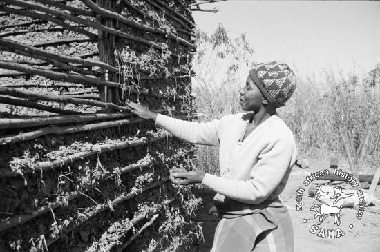 This black and white photograph of Mrs Hlatswayo building her new home in Driefontein, Mpumalanga, was taken by Gille de Vlieg in May 1984. The photograph was digitised by Africa Media Online (AMO) in 2009. |