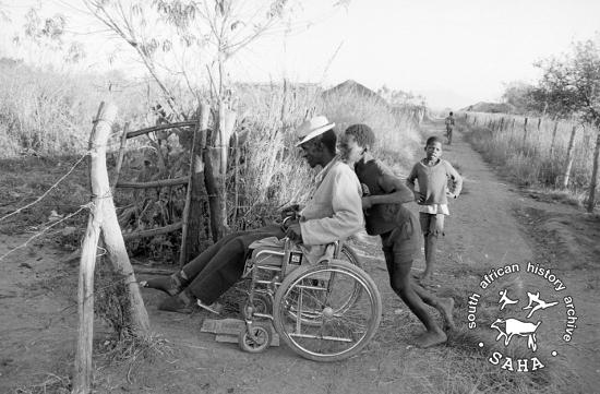 This black and white photograph of Mr Timothy Hlatswayo being pushed in a wheelchair by his son, was taken by Gille de Vlieg in May 1984 in Driefontein. The photograph was digitised by Africa Media Online (AMO) in 2009. |