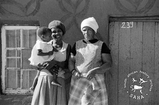 This black and white photograph of women and child in front of their house in Valspan in the Northern Cape was taken by Gille de Vlieg in 1984. This photograph was digitised by Africa Media Online (AMO) in 2009. |