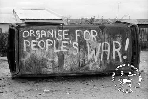This black and white photograph of a burnt combi with graffitti ('organise for people's war!') was taken by Gille de Vlieg in Tembisa in April 1985, and digitised by her in 2011.