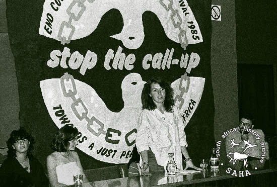 This black and white photograph of school children with Ian Moll at an End Conscription Campaign (ECC) festival in Johannesburg was taken by Gille de Vlieg in June 1985. This photograph was digitised by Africa Media Online (AMO) in 2009. |
