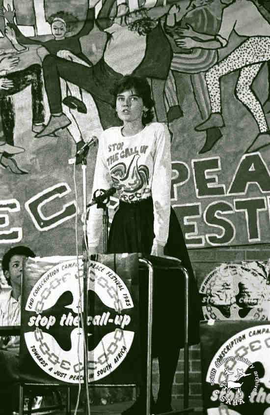 This black and white photograph of Claire Verbeek and Cheryl Carolus at an End Conscription Campaign (ECC) Peace Festival in Johannesburg was taken by Gille de Vlieg in June 1985. This photograph was digitised by Africa Media Online (AMO) in 2009. |