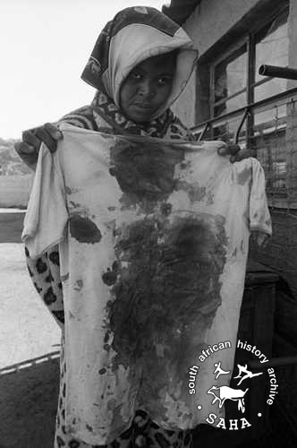 This black and white photograph of Flint Mazibuko's mother holding his blood-stained t-shirt was taken by Gille de Vlieg in Tembisa on 12 June 1985, and digitised by her in 2006.