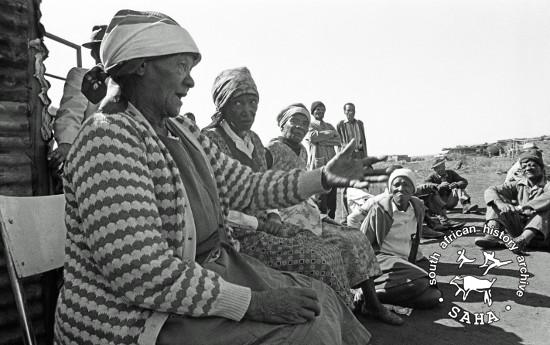 This black and white photograph of a woman speaking to a group in Barseba was taken by Gille de Vlieg in July 1985. Included in SAHA Land Act Project report, 2014. |