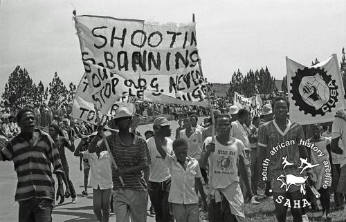 ► C46 :: A group of youth carrying CUSA banners in a rally in Mamelodi, 1985-12-03