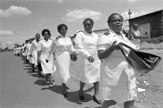 This black and white photograph of health care workers marching in their crisp white uniforms was taken by Gille de Vlieg during the Nurse's March in Tembisa on 27 January 1985. This photograph was digitised by Africa Media Online (AMO) in 2009.