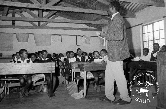 This black and white photograph of a schoolteacher with his class in a rural school in Braklaagte was taken by Gille de Vlieg on 15 September 1986. This photograph was digitised by Africa Media Online (AMO) in 2009. |