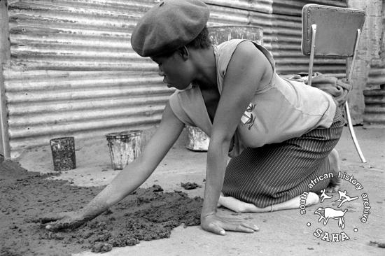 Woman making mud and dung floor, Braklaagte |