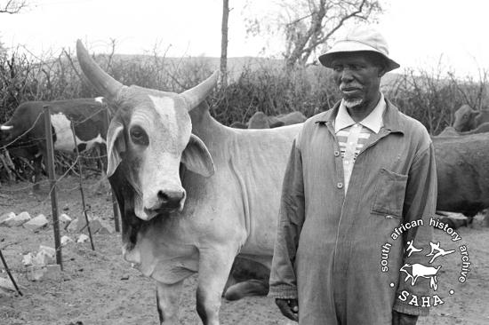 This black and white photograph of a man eyeing his bull in Braklaagte was taken by Gille de Vlieg on 9 October 1986. Included in SAHA Land Act Project report, 2014. |