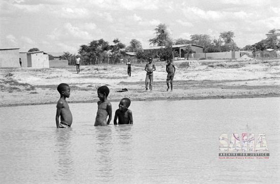 D35.01 :: Children swim at a water hole, Braklaagte, North West, 1986-11-27.