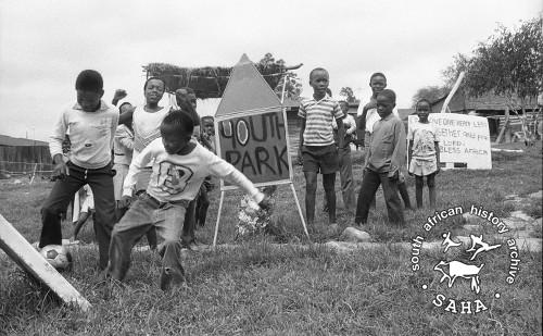 This is a black and white image of children playing soccer in the Alexandra Youth Park, taken by Gille de Vlieg, in January 1986. This photograph was digitised by Africa Media Online (AMO) in 2009. Included in the SAHA virtual exhibition: The Future is Our's |