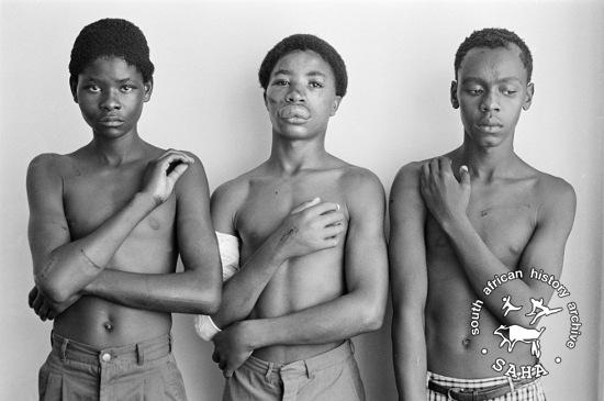 Zacharia Rapoo (16) Johannes Pilane (17) and Vitalious Xaba (17) Khatlehong youth beaten by police in Johannesburg, Gauteng, March 1988 |