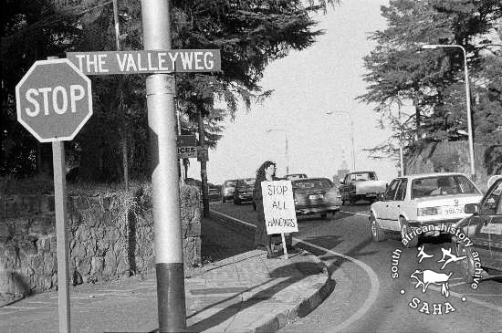 This black and white photograph of Black Sash member Harriet Gavshon protesting against the death penalty was taken by Gille de Vlieg in Johannesburg in 1988, and digitised by Africa Media Online (AMO) in 2009. |