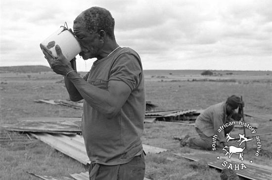 This black and white photograph of Daniel Molefe quenching his thirst during rebuilding in Mogopa was taken by Gille de Vlieg on 15 December 1988. Included in SAHA Land Act Project report, 2014. |