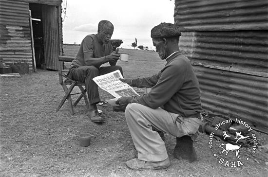 Daniel Molefe and friend drinking tea and reading The Weekly Mail, Mogopa |