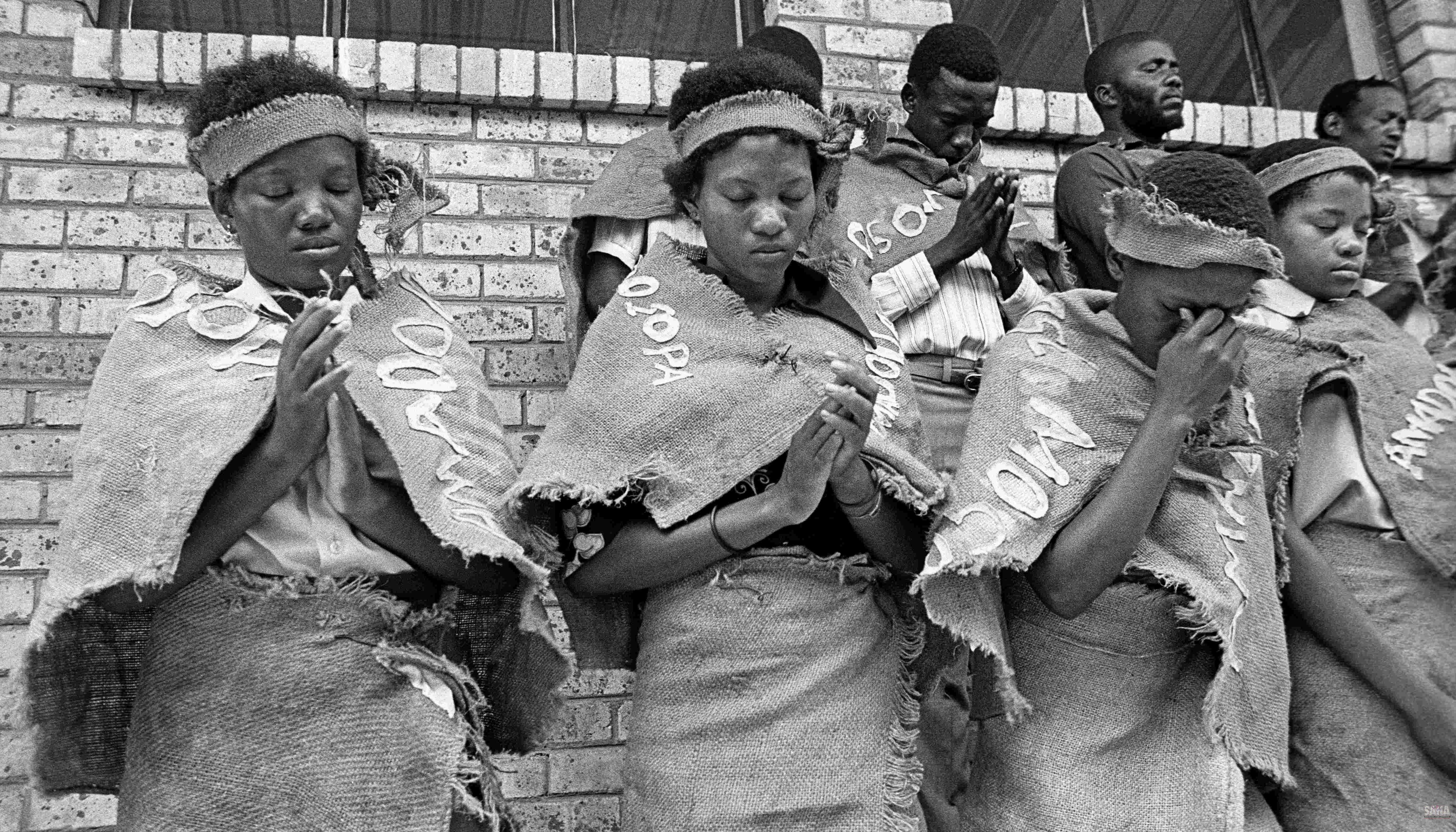 This black and white photograph of Mogopa students in a school play prayer in Onderstepoort for guests was taken by Gille de Vlieg on 02 February 1989. Included in SAHA Land Act Project report, 2014. |