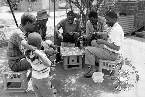 This black and white photograph of a child watching gamblers in a shebeen in Tembisa was taken by Gille de Vlieg on 24 March 1989. This photograph was digitised by Africa Media Online (AMO) in 2009.