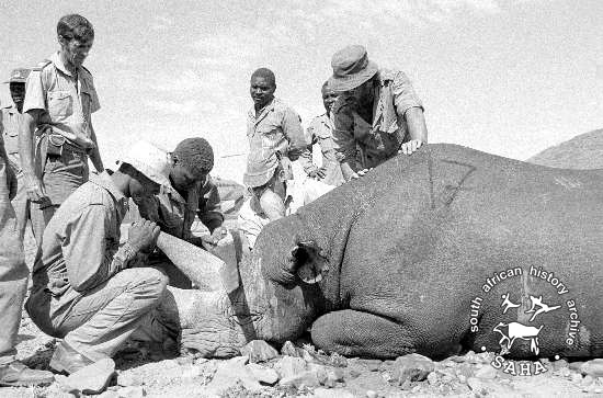 ► G16.2.1 :: Environmental workers sawing off rhino horn in an attempt to prevent poaching, south west of Etosha, Namibia, 1989-05-06.