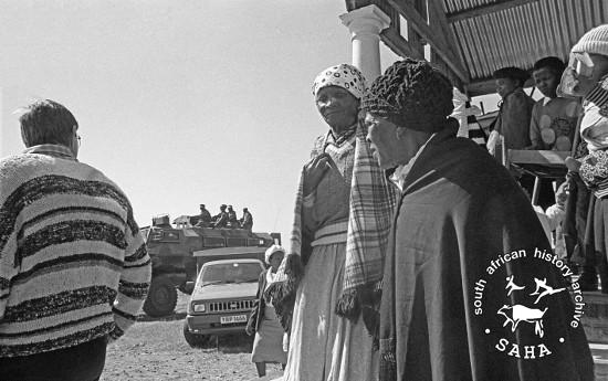 This black and white photograph of Bophuthatswana police arriving outside a church in Braklaagte was taken by Gille de Vlieg on 29 July 1989. This photograph was digitised by Gille de Vlieg. Included in SAHA Land Act Project report, 2014. |