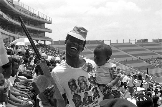 This black and white photograph of a man holding a homemade 'gun' and a child and wearing a Welcome Home T-shirt was taken by Gille de Vlieg in Soweto on 29 October 1989. This photograph was digitised by Africa Media Online (AMO) in 2009. |