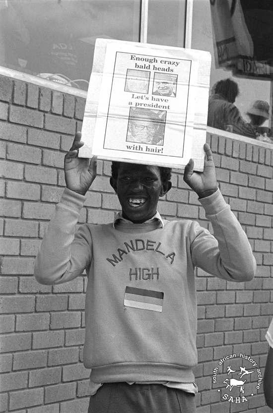 This black and white photograph of a youth holding a placard with the caption "Enough crazy bald heads. Let's have a president with hair!" was taken by Gille de Vlieg at the African National Congress (ANC) Welcome Home Rally for Robben Island leaders in Soweto on 29.10.1989. This photograph was digitised by Africa Media Online (AMO) in 2009.