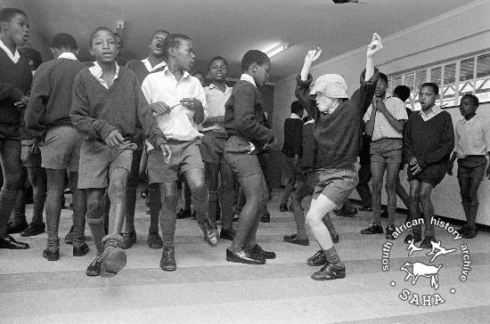 This black and white photograph of boys dancing is part of a series taken by Gille de Vlieg of the Ethokomala school for street children in a disused prison in Kinross in November 1989. This photograph was digitised by Africa Media Online (AMO) in 2009. |