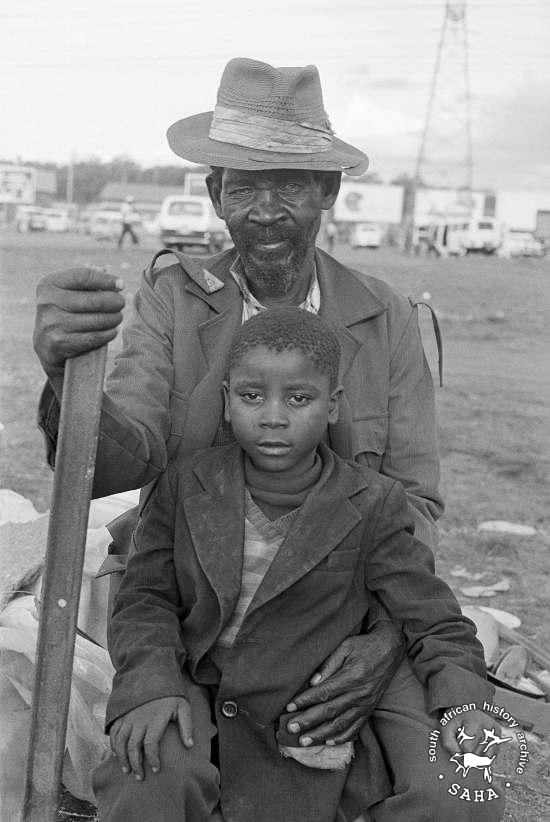 This black and white photograph of a grandfather and grandson living on open land near Oakmoor station in Tembisa, was taken by Gille de Vlieg on 8 November 1989. This photograph was digitised by Africa Media Online (AMO) in 2009.