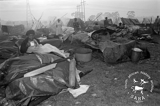 This black and white photograph of a woman having a mug of tea on open land near Oakmoor station in Tembisa was taken by Gille de Vlieg on the morning of 26 November 1989. This photograph was digitised by Africa Media Online (AMO) in 2009.