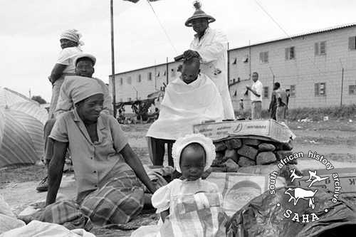 This black and white photograph of a man having his haircut outside a hostel was taken by Gille de Vlieg in January 1989 in Tembisa. Digitised by Africa Media Online (AMO) in 2009, this photograph was on display in the exhibition 'Entering Tembisa - an oral and photographic exploration of the community' in the Tembisa West Library to celebrate Heritage Day on September 24, 2011. This exhibition is part of an oral history and archival collection project on Tembisa, conducted by the South African History Archive (SAHA) in 2010 and 2011. |