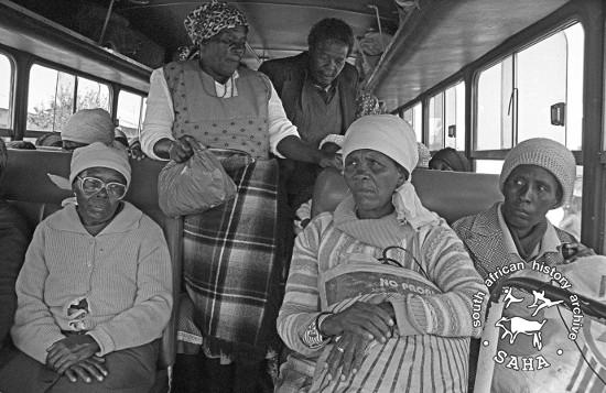 This black and white photograph of people returning to Braklaagte by bus was taken by Gille de Vlieg on 13 July 1989. This photograph was digitised by Gille de Vlieg. Included in SAHA Land Act Project report, 2014. |
