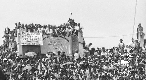 ► H01.31 :: Youth sitting on top of a high wall during a welcome home Rally for Mr Nelson Rolihlahla Mandela in Soccer City, 1990-02-13