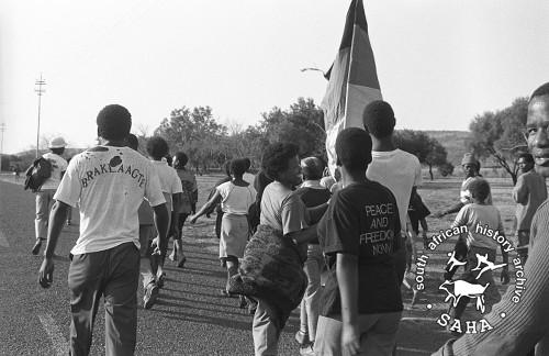 This is a black and white image of a group of youth walking in what seems to be a march in Braklaagte, taken by Gille de Vlieg, in July 1991. This photograph was digitised by Africa Media Online (AMO) in 2009. Included in the SAHA virtual exhibition: The Future is Our's |