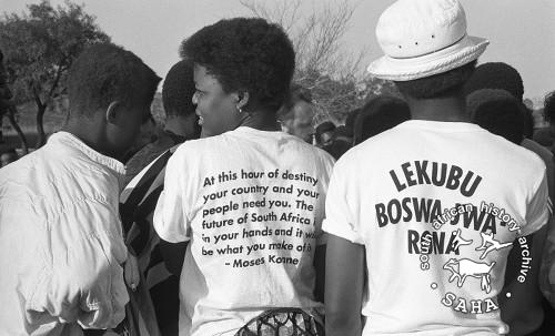 This is a black and white image of a group of youth in what seems to be a rally in Zeerust wearing t-shirts with writings on them, taken by Gille de Vlieg, in July 1991. This photograph was digitised by Africa Media Online (AMO) in 2009. Included in the SAHA virtual exhibition: The Future is Our's |