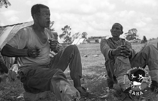 This black and white image of Daniel Molefe speaking at a lekgotla to discuss the return to Mogopa was taken by Gille de Vlieg in January 1989. Included in SAHA Land Act Project report, 2014. |