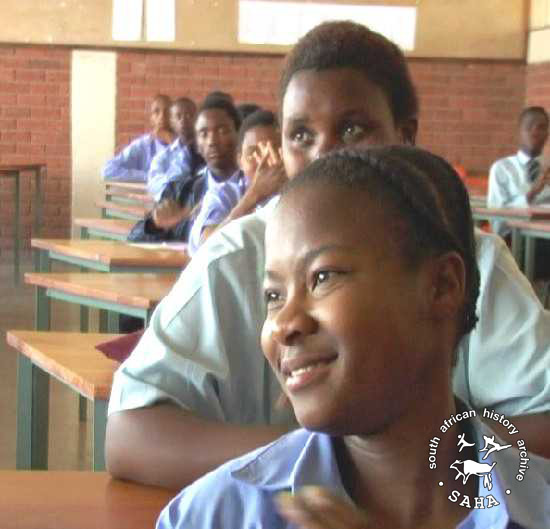 This is a still image of learners from Bodibeng High in Kroonstad listening during oral history presentation for the SAHA/Sunday Times School Oral History Project, from the 'Meeting history face-to-face - a guide to doing oral history' DVD.