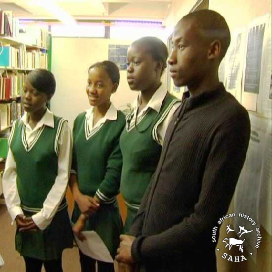This is a still image of learners from Khaiso High School in Polokwane visiting the University of Limpopo archive at Turfloop Campus during the SAHA/Sunday Times School Oral History Project,from the 'Meeting history face-to-face - a guide to doing oral history' DVD.