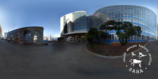 This colour photograph showing a panoramic view of the courtyard in front of the Johannesburg Central Police Station (previously known as John Vorster Square) was taken by Craig Matthew of DOXA for the Sunday Times Heritage Project (STHP) - a joint project between SAHA and the Sunday Times, 2007. Included in "Between Life and Death: Stories from John Vorster Square" - a DVD produced as part of this project, 2007 and the SAHA online exhibition - 'Between Life and Death: Stories from John Vorster Square', 2012. |