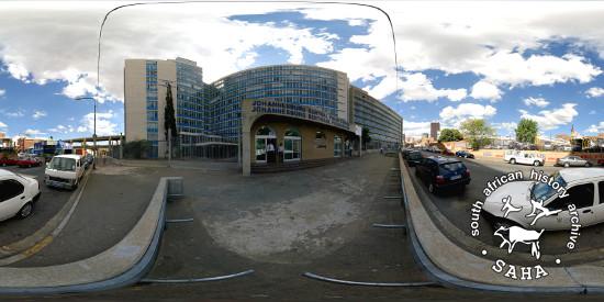 This colour photograph showing a panoramic view of the entrance to the Johannesburg Central Police Station (previously known as John Vorster Square) was taken by Craig Matthew of DOXA for the Sunday Times Heritage Project (STHP) - a joint project between SAHA and the Sunday Times, 2007. Included in "Between Life and Death: Stories from John Vorster Square" - a DVD produced as part of this project, 2007 and the SAHA online exhibition - 'Between Life and Death: Stories from John Vorster Square', 2012. |