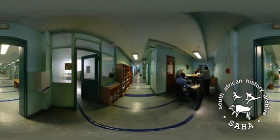 This colour photograph showing a panoramic view of the corridor on the 9th floor of the Johannesburg Central Police Station (previously known as John Vorster Square) was taken by Craig Matthew of DOXA for the Sunday Times Heritage Project (STHP) - a joint project between SAHA and the Sunday Times, 2007. Included in "Between Life and Death: Stories from John Vorster Square" - a DVD produced as part of this project, 2007 and the SAHA online exhibition - 'Between Life and Death: Stories from John Vorster Square', 2012. |