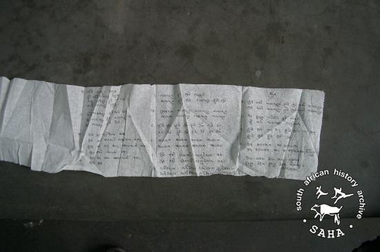 The Gujarati hymn was copied onto toilet paper by Dr Kantilal Naik whilst in detention. He was detained at John Vorster Square from October 1971 to February 1972. Included in SAHA online exhibition - 'Between Life and Death: Stories from John Vorster Square', 2012. |