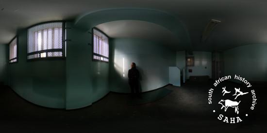 This colour photograph showing a panoramic view of Jabu Ngwenya in a cell at the Johannesburg Central Police Station (previously known as John Vorster Square) was taken by Craig Matthew of DOXA for the Sunday Times Heritage Project (STHP) - a joint project between SAHA and the Sunday Times, 2007. Included in "Between Life and Death: Stories from John Vorster Square" - a DVD produced as part of this project, 2007 and the SAHA online exhibition - 'Between Life and Death: Stories from John Vorster Square', 2012. |
